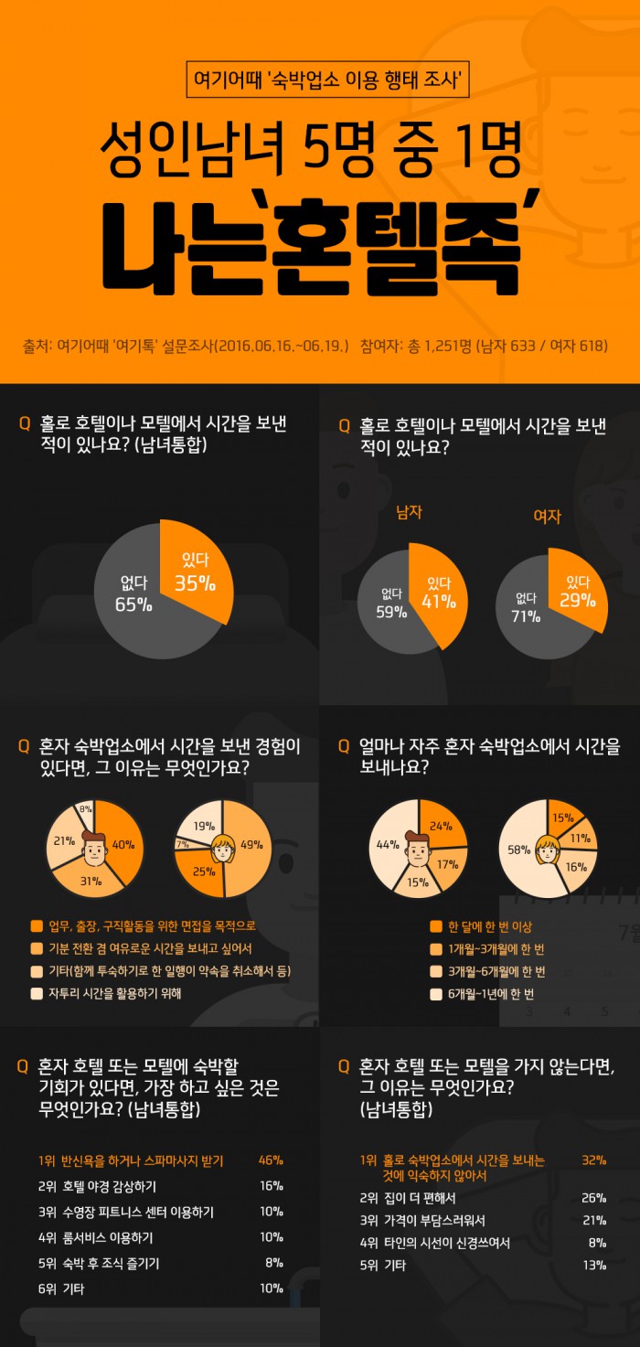 조사 결과에 따르면, '홀로 숙박업소를 이용한 경험'을 묻는 질문에 성인남녀 3명 중 1명(35%)이 "있다"고 답했다. 성별로는 남자 2명 중 1명(41%), 여성 3명 중 1명(29%)이 홀로 호텔이나 중소형호텔 방문 경험이 있었다.