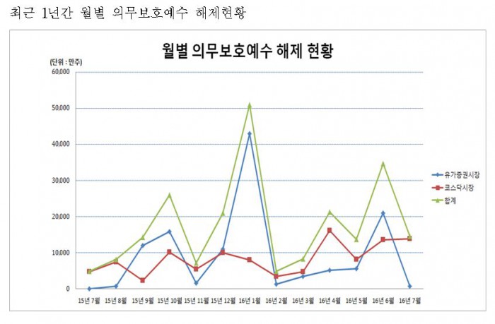 올해 7월 중 의무보호예수 해제주식수량은 지난 6월(3억4700만주)에 비해 57.8% 감소했으며, 지난해 7월(4900만주)에 비해서는 197.8% 증가한 수준이다.<자료출처=한국예탁결제원>