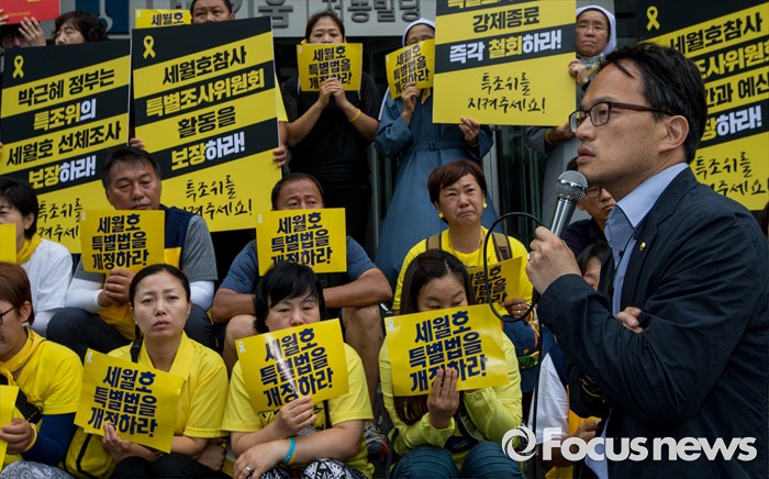 (서울=포커스뉴스) 1일 오전 서울 중구 나라키움저동빌딩 앞에서 열린 '세월호 특조위 성역없는 진상규명 조사 지속 지지 기자회견'에 참석한 박주민 더불어민주당 의원이 특조위 활동 보장을 요구하는 발언을 하고 있다.