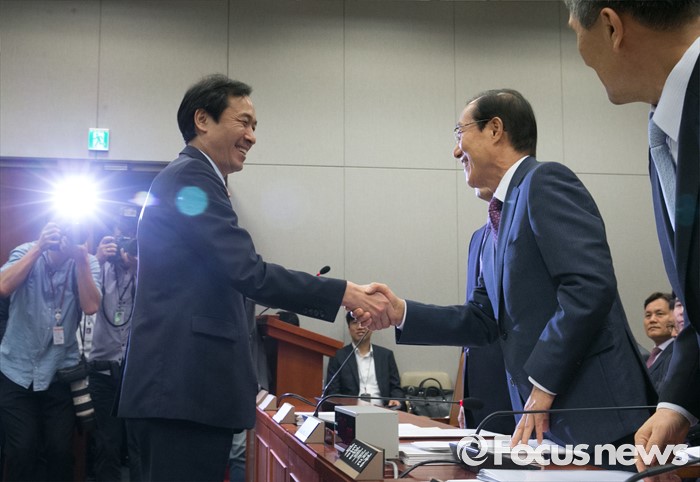 (서울=포커스뉴스) 1일 오전 서울 여의도 국회에서 열린 운영위원회 전체회의에 참석한 우상호(왼쪽) 더불어민주당 원내대표와 이원종(오른쪽 두번째) 대통령비서실장이 인사하고 있다.