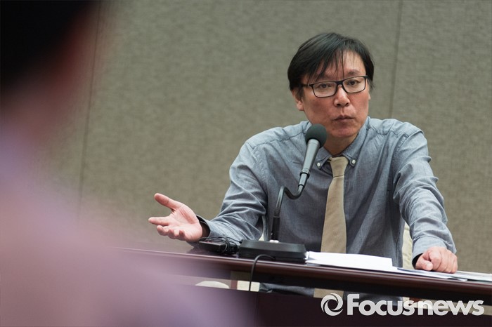 (서울=포커스뉴스) 이동열 투씨엠 대표가 1일 오전 서울 중구 프레스센터에서 열린 제2롯데월드 입면 표절의혹 기자회견에 참석해 발언하고 있다. 이 대표는 자사 디자인 '스타 컬렉션'을 45도 회전하면 제2롯데월드 에비뉴엘관의 디자인과 일치한다고 주장했다.