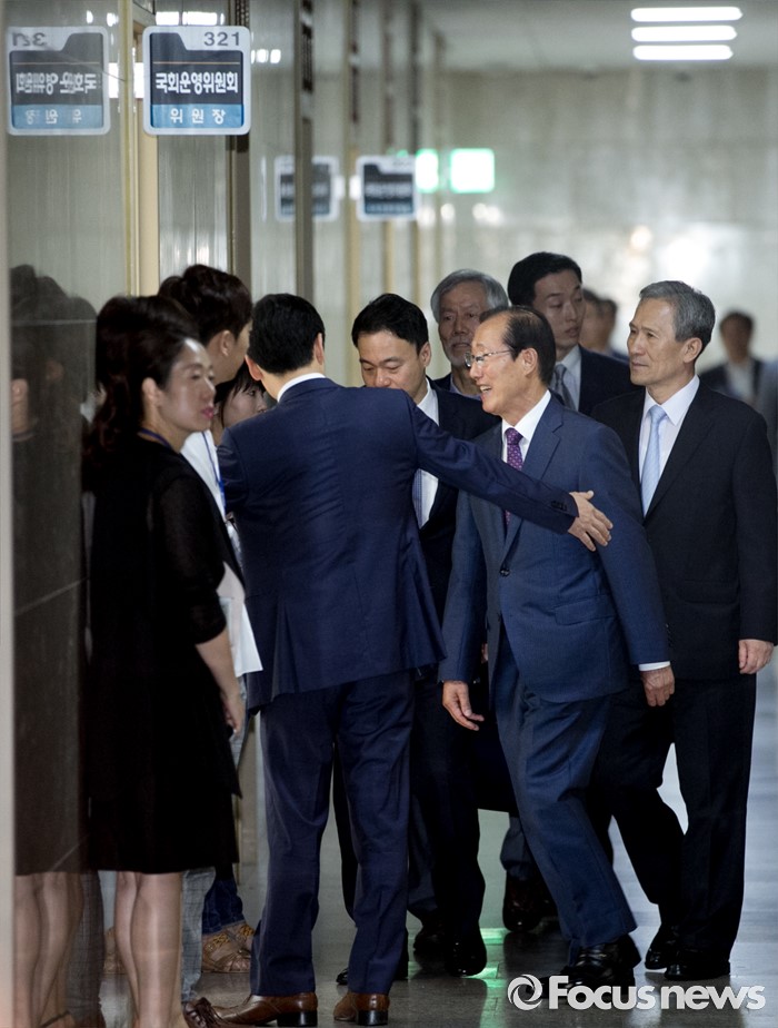(서울=포커스뉴스) 1일 오전 서울 여의도 국회에서 열린 운영위원회 전체회의에 이원종(왼쪽) 대통령비서실장과 김관진 국가안보실장이 참석하기에 앞서 정진석 위원장과 면담을 위해 이동하고 있다.