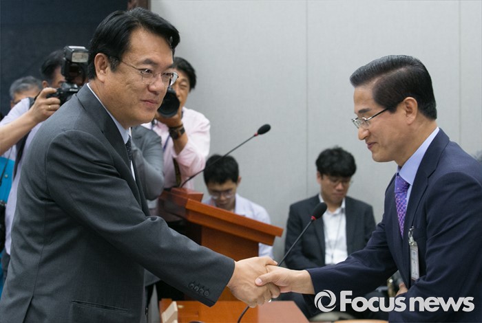 (서울=포커스뉴스) 1일 오전 서울 여의도 국회에서 열린 운영위원회 전체회의에 참석한 정진석(왼쪽) 새누리당 원내대표와 이영래 대통령경호실 차장 직무대리가 인사하고 있다.