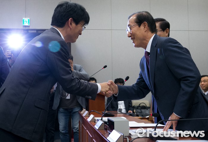 (서울=포커스뉴스) 1일 오전 서울 여의도 국회에서 열린 운영위원회 전체회의에 참석한 박완주(왼쪽) 더불어민주당 간사와 이원종 대통령비서실장이 인사하고 있다.
