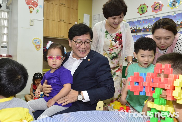 (서울=포커스뉴스) 어린이집을 종일반과 맞춤반으로 나눈 맞춤형 보육 제도가 시행된 1일 서울 성동구 신영창의어린이집을 방문한 정진엽 보건복지부 장관이 원아들과 대화하고 있다.