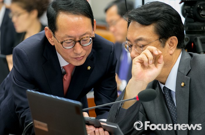 (서울=포커스뉴스) 1일 오전 서울 여의도 국회에서 열린 운영위원회 전체회의에 참석한 정진석(오른쪽) 위원장과 김도읍 새누리당 간사가 대화하고 있다.