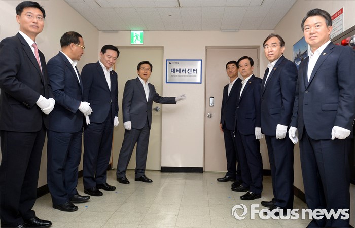 (서울=포커스뉴스) 황교안 국무총리를 비롯한 참석자들이 1일 오후 서울 종로구 정부서울청사에서 제1차 국가테러대책위원회를 마친 후 대테러센터 현판식을 하고 있다. 왼쪽부터 시계방향으로 최윤수 국정원 제2차장, 홍윤식 행정자치부 장관, 김현웅 법무부 장관, 황교안 국무총리, 문영기 대테러센터장, 한민구 국방부 장관, 이석준 국무조정실장, 강신명 경찰청장.