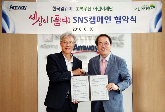 박세준 한국암웨이 대표는 "한국암웨이는 사회의 온정이 필요한 곳을 찾아 지난 25년간 크고 작은 노력을 해 왔고, 특히 어린이들의 신체적, 정신적 건강에 보탬이 되고자 다양한 활동들을 전개해 왔다"며 "한국암웨이 창립 25주년을 맞는 올해엔 초록우산 어린이재단과 함께 무연고ㆍ유기 아동을 위한 의미 있는 캠페인을 진행해 미래의 희망인 우리 아이들이 건강하게 사회의 주역으로 성장하는 데 작은 힘을 보태고자 한다"고 말했다.박세준 한국암웨이 대표이사(왼쪽)와 이제훈 초록우산 어린이재단 회장이 지난달 30일 서울 삼성동 아셈타워 한국암웨이에서 '세상이 품다' 캠페인 협약을 기념하고 있다. 2016.07.01 <사진제공=한국암웨이>