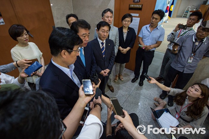 (서울=포커스뉴스) 1일 오후 서울 여의도 국회에서 더불어민주당 공정언론 특위 민주주의회복TF 소속 의원 및 국회 미래창조과학방송통신위원회 소속 의원들이 이정현 새누리당 의원의 청와대 홍보수석 재임시 KBS 보도 개입과 관련해 브리핑을 마친 뒤 취재진 질문에 답하고 있다.