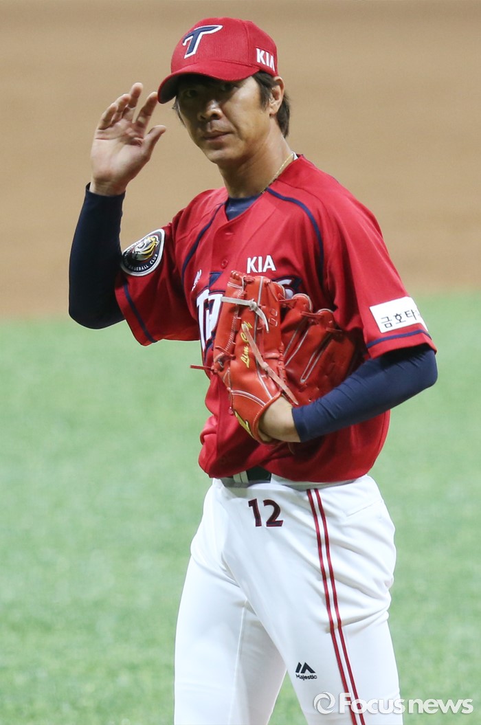(서울=포커스뉴스) 1일 서울 고척 스카이돔에서 열린 2016 프로야구 KIA-넥센 경기 4회말 2사 1루에서 KIA 임창용이 도박 파문으로 인한 리그 50% 출장정지를 끝내고 등판해 넥센 김민성을 7구 만에 삼진 아웃시키고 덕아웃으로 들어가고 있다.