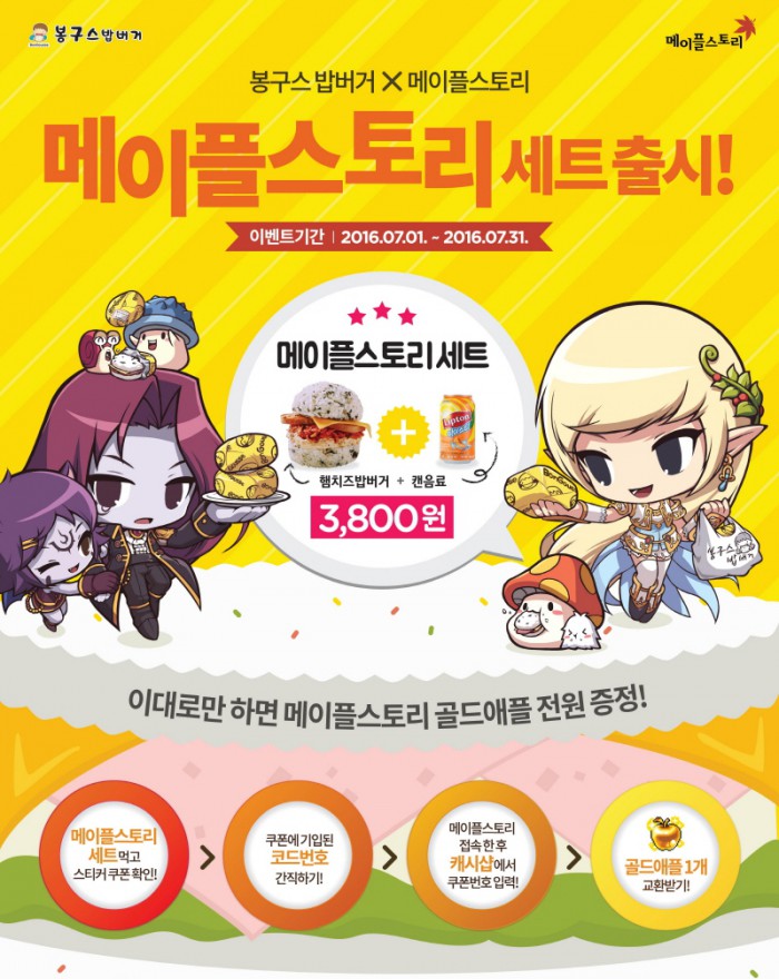 봉구스밥버거 전국 930여 개 매장에서 판매되는 메이플스토리 세트 메뉴는 햄치즈밥버거와 캔음료로 구성돼 있으며, 세트 메뉴를 구매하는 이용자 전원에게는 메이플스토리의 골드애플 아이템을 받을 수 있는 교환쿠폰을 증정한다.