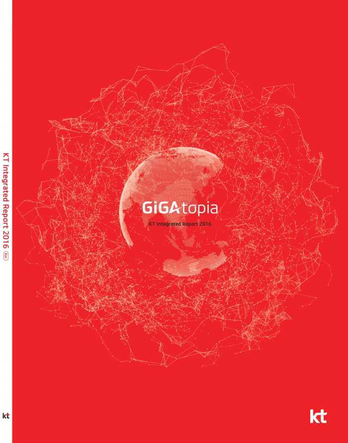 윤종진 KT 홍보실장은 “KT의 2016 통합보고서에는 전 지구적인 문제에 대한 해결책을 제공하기 위한 KT의 끊임 없는 연구와 노력의 과정이 담겼다”며 “앞으로도 지속가능경영 강화를 통해 KT가 꿈꾸는 기가토피아를 실현하고 인류의 지속 가능한 성장과 발전을 위해 힘쓸 것”이라고 밝혔다.KT가 기가토피아 실현 전략을 담은 통합보고서를 발간했다.<사진제공=KT>