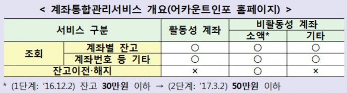 정보 조회 외에도 '비활동 계좌'에 대한 해지도 손쉽게 할 수 있을 전망이다. 잔고 30만원 이하가 들어있지만 조회일 현재 최종 입출금일(또는 만기일)로부터 1년 이상 경과한 '소액 비활동성 계좌'의 경우 잔고 이전과 해지까지 가능해진다.