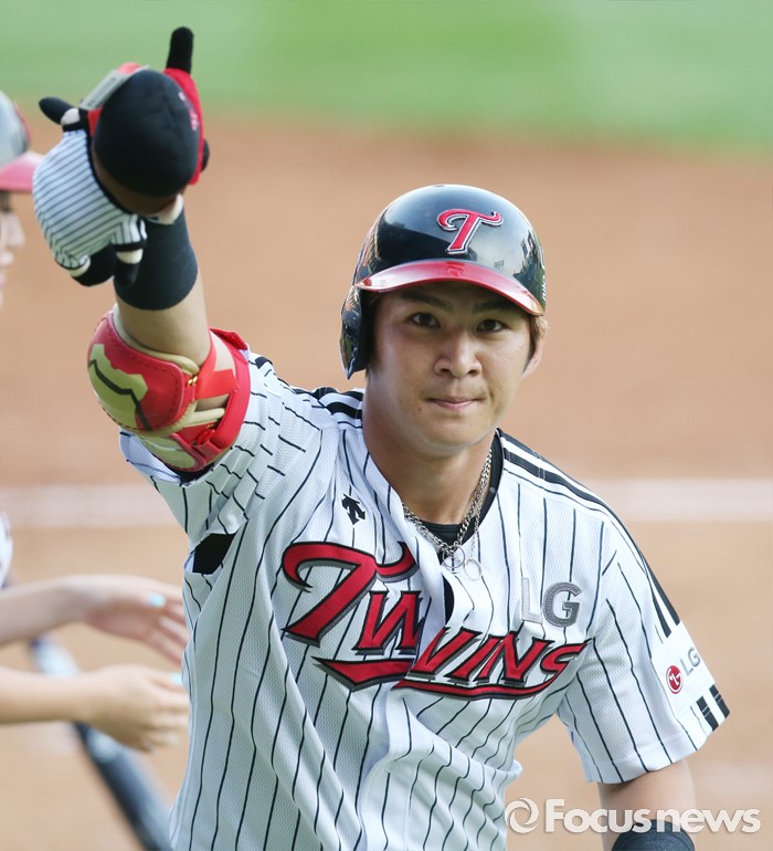 (서울=포커스뉴스) 3일 서울 잠실구장에서 열린 2016 프로야구 SK-LG 경기 2회말 2사후 LG 오지환이 우월 솔로 홈런을 치고 홈인하면서 관중석을 향해 세리머니를 하고 있다.