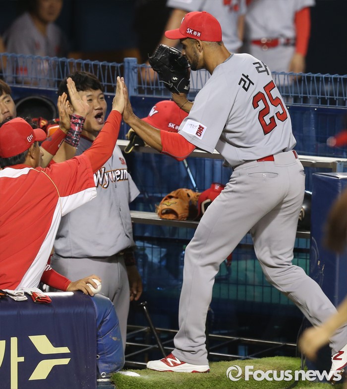 (서울=포커스뉴스) 3일 서울 잠실구장에서 열린 2016 프로야구 SK-LG 경기에서 SK 투수 라라가 6회말을 마치고 덕아웃에서 동료들의 환영을 받고 있다.