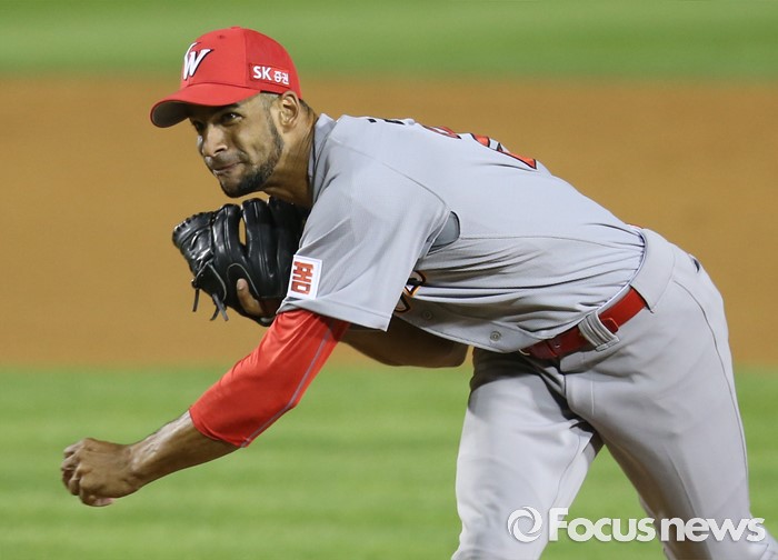 (서울=포커스뉴스) 3일 서울 잠실구장에서 열린 2016 프로야구 SK-LG 경기에서 SK 투수 라라가 6회말 구원 등판해 투구하고 있다.