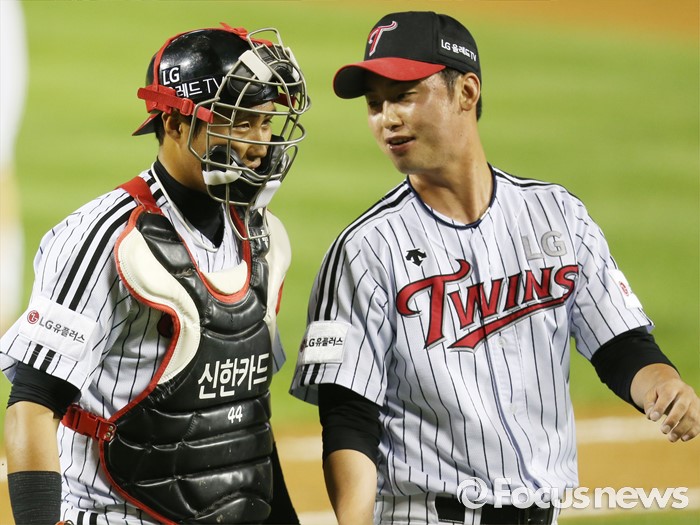 (서울=포커스뉴스) 3일 서울 잠실구장에서 열린 2016 프로야구 SK-LG 경기에서 포수 마스크를 쓴 LG 채은성이 투수 진해수와 9회초 수비를 마치고 함꼐 덕아웃으로 들어가고 있다.