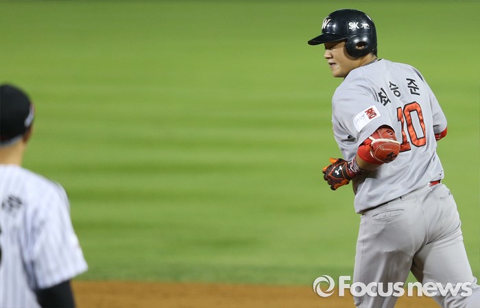 (서울=포커스뉴스) 3일 서울 잠실구장에서 열린 2016 프로야구 SK-LG 경기 8회초 1사 1루에서 SK 최승준이 우중월 2점 홈런을 치고 베이스를 돌면서 정성훈을 바라보고 있다.