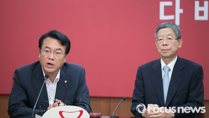 (서울=포커스뉴스) 4일 오전 서울 여의도 새누리당사에서 열린 혁신비상대책위원회의에 참석한 정진석 원내대표가 발언하고 있다. 오른쪽은 김희옥 위원장.