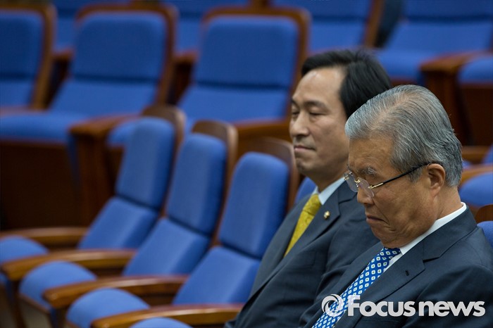 (서울=포커스뉴스) 김종인(오른쪽) 더불어민주당 비상대책위 대표와 우상호 원내대표가 4일 오전 서울 여의도 국회에서 열린 의원총회에 참석 하고 있다.