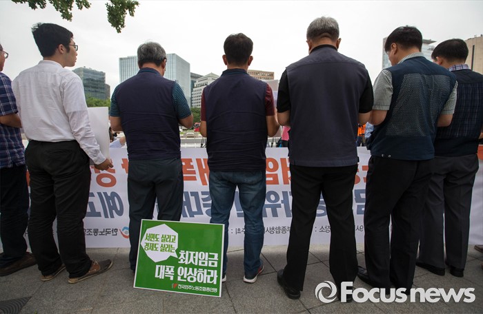 (서울=포커스뉴스) 4일 오전 서울 종로구 정부서울청사 앞에서 양대노총의 최저임금 대폭인상 및 노동자위원 중대 결단을 예고하는 기자회견이 열리고 있다.