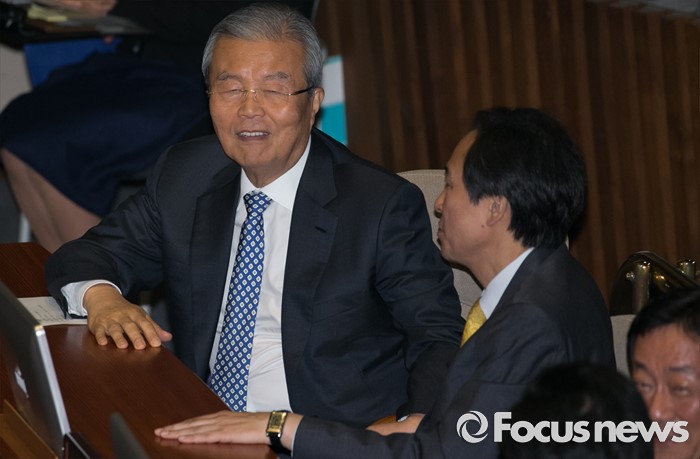 (서울=포커스뉴스) 4일 오전 서울 여의도 국회에서 열린 343회 국회(임시회) 6차 본회의, 경제에 관한 대정부 질문에 참석한 김종인(왼쪽) 더불어민주당 비대위 대표와 우상호 원내대표가 대화하고 있다.