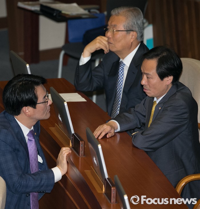 (서울=포커스뉴스) 4일 오전 서울 여의도 국회에서 열린 343회 국회(임시회) 6차 본회의, 경제에 관한 대정부 질문에 참석한 우상호 더불어민주당 원내대표와 박용진 대표비서실장이 대화하고 있다.