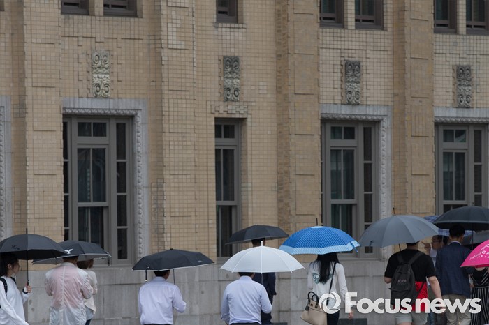(서울=포커스뉴스) 전국에 호우주의보가 내려진 4일 오전 서울 종로구 광화문 광장에서 시민들이 우산을 들고 지나가고 있다.