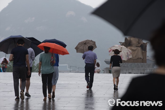 (서울=포커스뉴스) 전국에 호우주의보가 내려진 4일 오전 서울 종로구 광화문 광장에서 시민들이 우산을 들고 지나가고 있다.