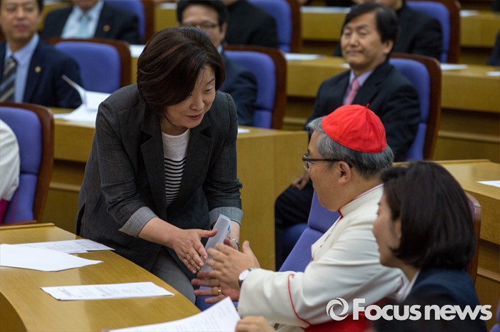 (서울=포커스뉴스) 염수정(가운데) 추기경과 심상정 정의당 상임대표가 4일 오전 서울 여의도 국회의원회관에서 열린 '생명존중포럼 창립총회'에 참석해 악수 하고 있다.