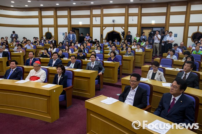 (서울=포커스뉴스) 염수정(왼쪽 두 번째) 추기경을 비롯한 국회 카톨릭교우회 소속 의원들이 4일 오전 서울 여의도 국회의원회관에서 열린 '생명존중포럼 창립총회'에 참석 하고 있다.