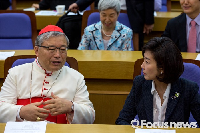 (서울=포커스뉴스) 염수정(왼쪽) 추기경과 나경원 새누리당 의원이 4일 오전 서울 여의도 국회의원회관에서 열린 '생명존중포럼 창립총회'에 참석해 대화를 나누고 있다.