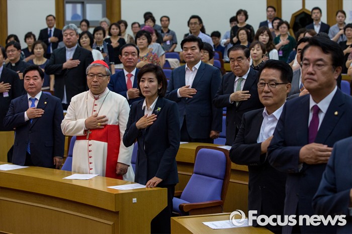 (서울=포커스뉴스) 염수정(왼쪽 두 번째) 추기경을 비롯한 국회 카톨릭교우회 소속 의원들이 4일 오전 서울 여의도 국회의원회관에서 열린 '생명존중포럼 창립총회'에 참석해 국민의례 하고 있다.