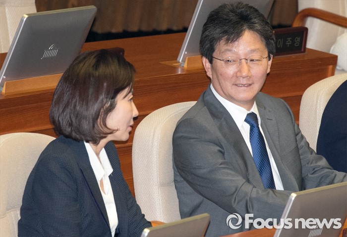 (서울=포커스뉴스) 4일 오후 서울 여의도 국회에서 열린 343회 국회(임시회) 6차 본회의, 경제에 관한 대정부 질문에 참석한 유승민(오른쪽), 나경원 새누리당 의원이 대화하고 있다.