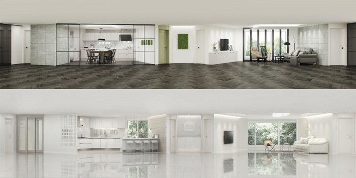 한샘이 이번에 출시한 신규 스타일패키지 '소프트 엣지'는 그린과 브라운 등 차분한 색상의 바닥재와 벽지를 사용하며 '심플 엣지' 스타일은 화이트톤이 주를 이룬다.