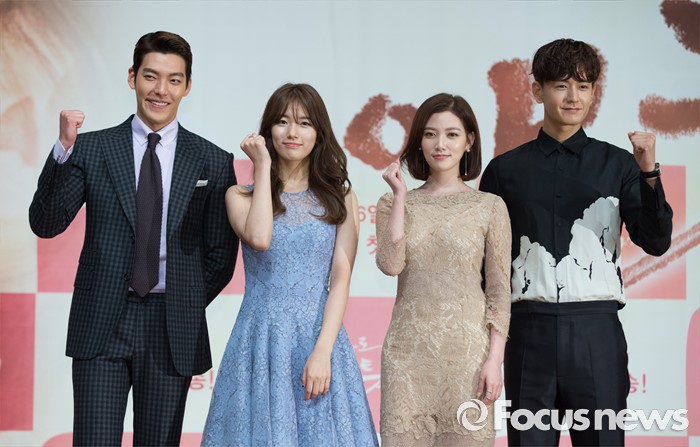 (서울=포커스뉴스) 4일 오후 서울 용산구 하얏트호텔 그랜드볼룸에서 열린 KBS 특별기획드라마 '함부로 애틋하게' 제작발표회에 참석한 배우 김우빈(왼쪽부터), 배수지, 임주은, 임주환이포토타임을 갖고 있다.