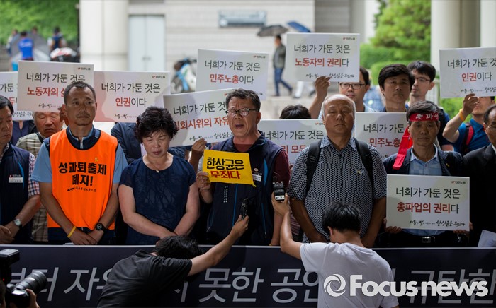 (서울=포커스뉴스) 4일 오후 서울중앙지법 앞에서 한상균 민주노총 위원장의 1심 선고 공판 후 열린 기자회견에 참석한 최종진 부위원장이 판결의 부당함을 주장하고 있다. 지난해 11월 열린 민중총궐기 대회 불법 시위 주도 혐의로 기소된 한 위원장은 이날 열린 1심 재판에서 징역 5년을 선고받았다.