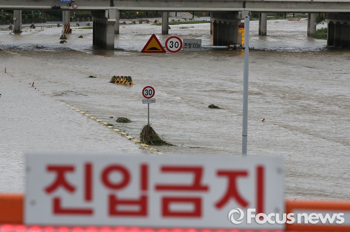 (청주=포커스뉴스) 충청 및 중부지역에 호우경보가 발생한 4일 오후 충북 청주시 무심천 하상도로가 내린비로 잠겨 있다.