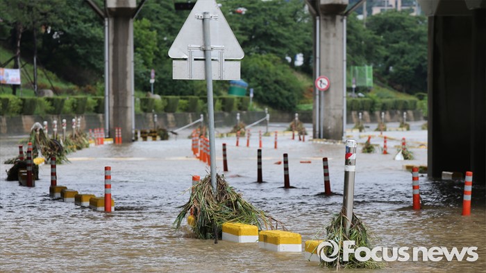 (청주=포커스뉴스) 충청 및 중부지역에 호우경보가 발생한 4일 오후 충북 청주시 무심천 하상도로가 내린비로 잠겨 있다.