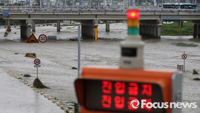 (청주=포커스뉴스) 충청 및 중부지역에 호우경보가 발생한 4일 오후 충북 청주시 무심천 하상도로가 내린비로 잠겨 있다.