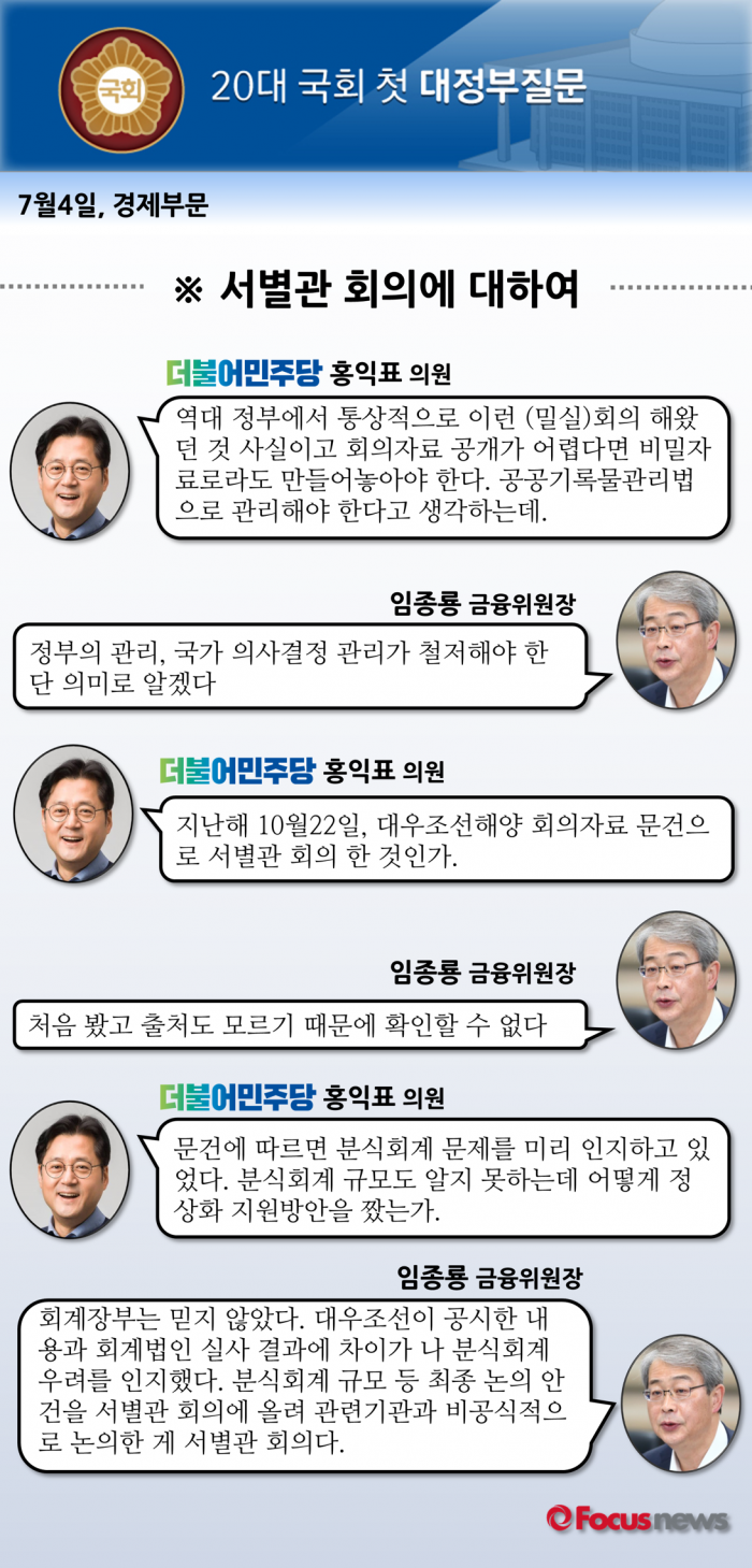 (대우조선의 공시된)회계장부는 믿지 않았다. 대우조선이 공시한 내용과 회계법인 실사 결과에 차이가 나 분식회계 우려를 인지했다. 분식회계 규모 등 최종 논의 안건을 서별관회의에 올려 관련기관과 비공식적으로 논의한 게 서별관회의다.