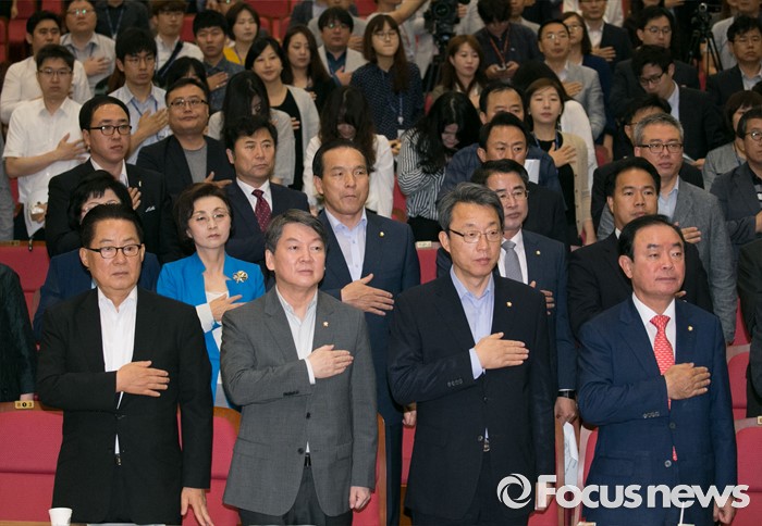 (서울=포커스뉴스) 5일 오전 서울 여의도 국회 의원회관에서 열린 국민의당 성희롱 예방교육에 참석한 박지원(앞줄 왼쪽부터) 비대위원장, 안철수 전 대표, 김성식 정책위의장, 장병완 의원 등이 국기에 대한 경례를 하고 있다.