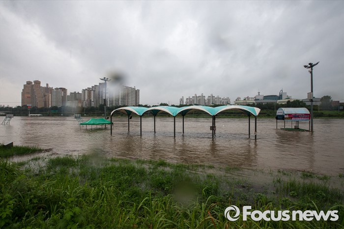 (서울=포커스뉴스) 최고 300mm 물폭탄이 내릴 것으로 예고되어 전국적으로 호우주의보와 경보가 내린 5일 오전 서울 중랑구 중랑천 월릉교 인근 둔치의 시민공원이 물에 잠겨 있다.