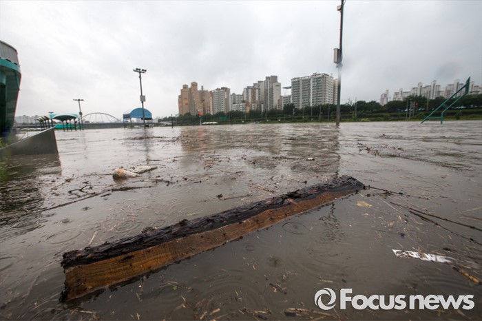 (서울=포커스뉴스) 최고 300mm 물폭탄이 내릴 것으로 예고되어 전국적으로 호우주의보와 경보가 내린 5일 오전 서울 중랑구 중랑천 월릉교 인근 둔치의 시민공원이 물에 잠겨 있다.