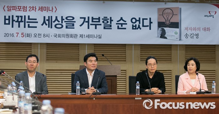 (서울=포커스뉴스) 5일 오전 서울 여의도 국회 의원회관에서 열린 국가미래전략포럼(일명 알파포럼) 2차 세미나에 참석한 원유철(왼쪽 두번째) 새누리당 의원과 송길영(오른쪽 두번째) 다음소프트 부사장 등이 자리하고 있다.