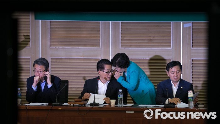 (서울=포커스뉴스) 5일 오전 서울 여의도 국회 의원회관에서 열린 국민의당 의원총회에 참석한 박지원(왼쪽 두번째) 비상대책위원장이 모두발언을 마친 뒤 조배숙(오른쪽 두번째) 의원 등과 비공개 논의를 하고 있다.