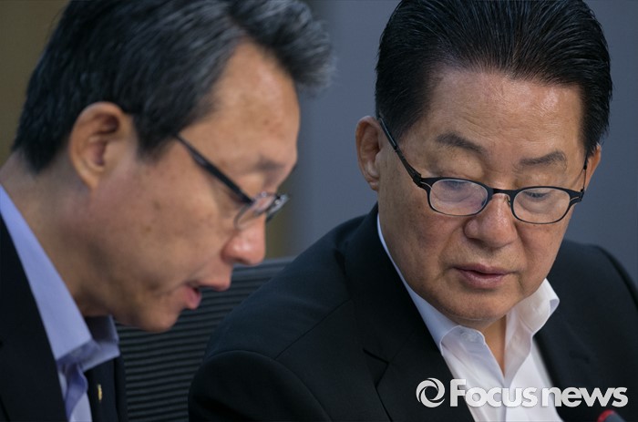 (서울=포커스뉴스) 5일 오전 서울 여의도 국회 의원회관에서 열린 국민의당 의원총회에 참석한 박지원(오른쪽) 비대위원장과 김성식 정책위의장이 대화하고 있다.