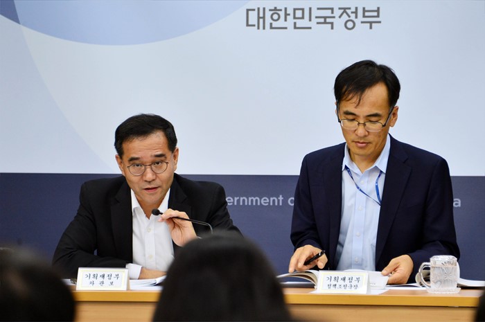 (세종=포커스뉴스) 이찬우 기획재정부 차관보가 4일 정부세종청사 기획재정부 브리핑룸에서 서비스경제 발전전략과 관련해 관계부처와 합동 사전브리핑을 하고 있다. 오른쪽은 차영환 정책조정국장. <사진제공=기획재정부>