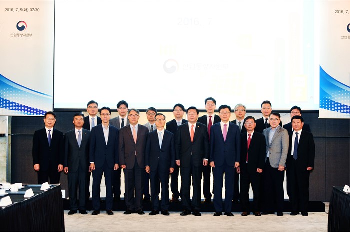 (서울=포커스뉴스) 주형환 산업통상자원부 장관이 5일 오전 서울 소공동 플라자호텔 다이아몬드홀에서열린 에너지신산업 종합대책 토론회에서 참석자들과 기념촬영 하고 있다. 이날 토론회에는 손양훈 인천대 교수, 강기석 서울대 교수, 김성우 삼정KPMG 본부장, 이해석 고려대 교수, 송재호 국제가스연맹 부회장 등 에너지미래전략위원과 권문식 현대자동차 부회장, 김태극 LS CNS 부사장, 윤경림 KT 부사장, 정도양 PNE시스템즈 대표, 곽창호 포스코경영연구원장, 표인수 법무법인 태평양 변호사 등 관계자 20여명이 참석했다. <사진제공=산업통상자원부>