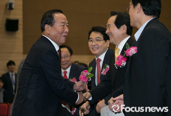 (서울=포커스뉴스) 5일 오전 서울 여의도 국회 의원회관에서 열린 미래성장 경제정책포럼 창립총회에 참석한 정세균(오른쪽 두번째) 국회의장과 서청원(왼쪽) 새누리당 의원이 인사하고 있다.
